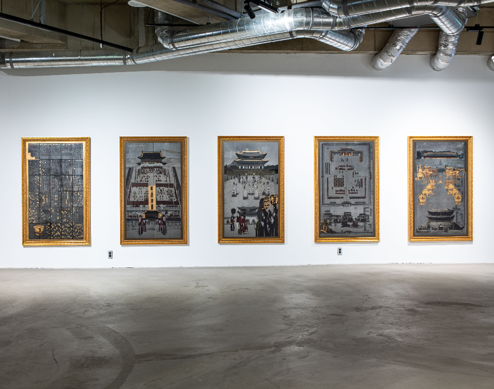 《생태의 집 – 한옥》김홍식, 해동 육룡이 나르샤, 2019-2023, 스테인리스 스틸에 돋을새김, 잉크, 실크스크린, 액자, 각 176×110cm