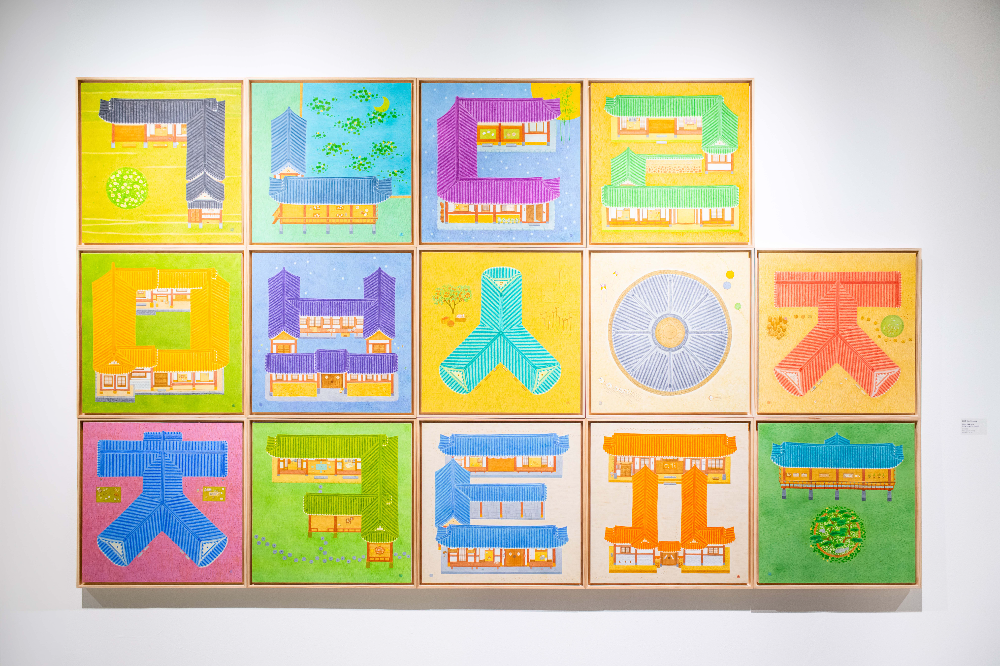 《생태의 집 – 한옥》김도영, 한옥에서 한글을 보다 II, 2019-2022, 한지에 분채, 각 63 × 63 cm