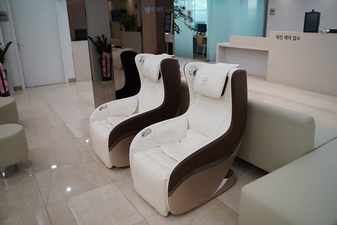 특히, 외래 진료 시 대기 시간이 길어질 수 있는 2층 외래 공간에는 안마의자를 설치하여 단순한 대기 시간을 넘어 환자분들의 몸과 마음이 휴식할 수 있도록 배려했습니다. 병원을 찾아주시는 분들 대부분이 통증이나 불편함을 안고 계시기에, 작지만 실질적인 회복의 요소로서 마련한 공간입니다. 아울러 저희 아내가 해당 안마의자 브랜드의 광고 모델로 활동한 인연 덕분에 좋은 조건으로 안마의자를 제공받아, 병원의 컬러와 디자인에 최대한 어울리도록 신중하게 선택했습니다.