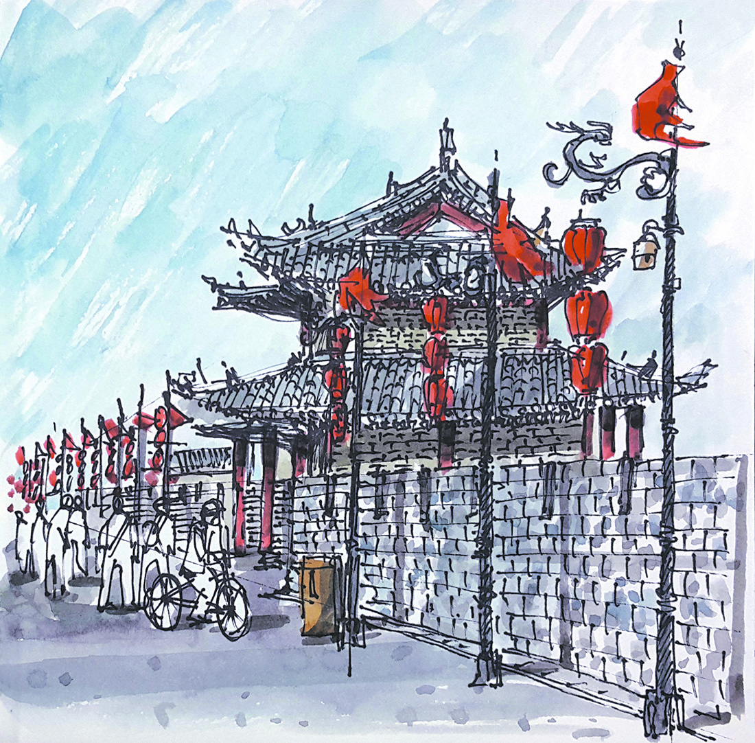벽돌로 이루어진 성벽 위 보행로 위에는 그늘을 찾거나 양산을 쓰고 걷는 관광객들 외에도 자전거나 전동차를 타고 이동하는 무리들도 눈에 띈다. 길이와 높이, 넓이를 우리네 성벽과 비교하면 역시 스케일이 대단하다. 이 거대한 성벽을 따라 거닐던 순간은 마치 과거의 어느 한 장면 속으로 빨려 들어가는 듯했다. 웅장한 성벽 위에서 바라본 시안 시내는 고요하면서도 힘찬 기운을 뿜어내고 있었고, 굽이굽이 이어진 길 위에는 수많은 이야기들이 녹아 있는 듯하다. 석양빛에 물든 성벽은 더욱 신비로운 분위기를 자아냈고, 그 위를 걷는 나의 그림자는 마치 천년의 시간을 걷는 순례자 같았다.