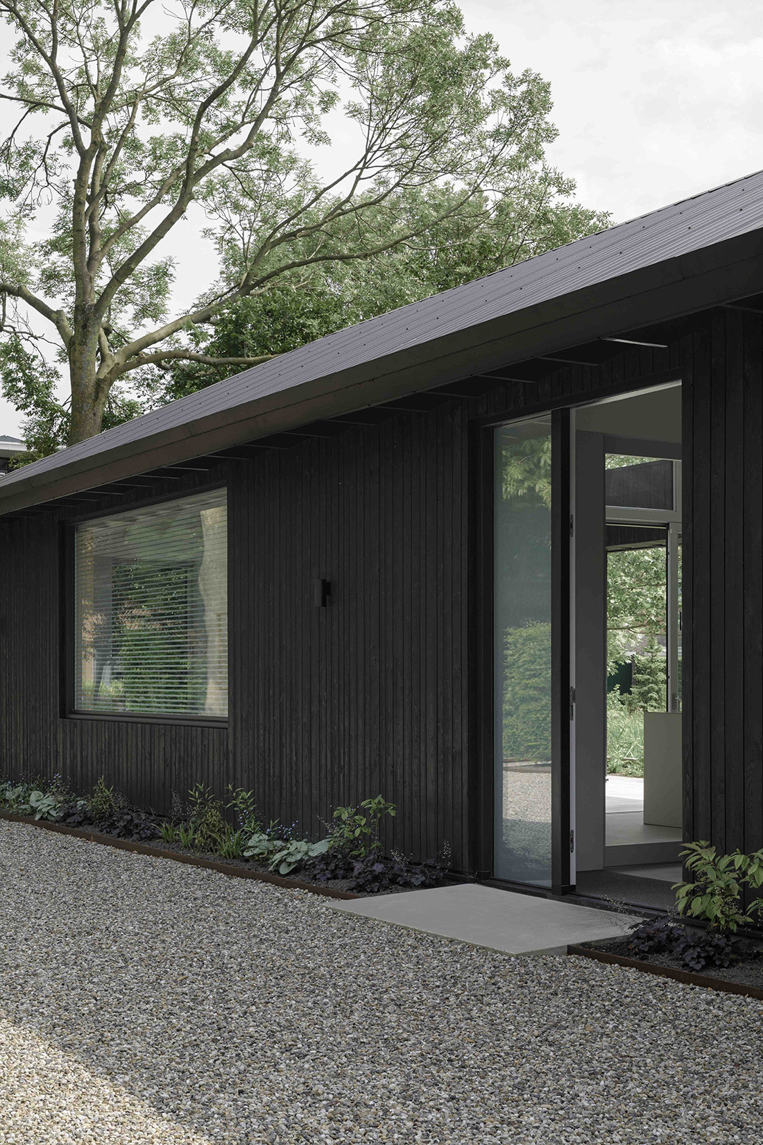 SeniorShelter_i29_22 이 집은 전체 화이트 컬러와 우드의 조화로 차분하면서도 자신감 있는 분위기를 풍겨낸다. 왁스 마감 목재 외관은 샌드위치 패널로 제작된 현대적인 지붕을 지탱하며, 미니멀한 빗물받이가 통합되어 있다. 지붕은 건물 외벽까지 확장되어, 차폐된 통로를 만들고 내부의 공간감을 더욱 강조해 준다. 이로 인해 실내에서는 노출된 지붕이 공간감에 중요한 역할을 하며, 집의 기능과 주변 녹지를 하나로 통합시킨다.