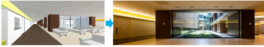 다음 사진은 BIM으로 도출한 특정 시점입니다. 데이터에 색감과 재료 등을 입력하면 그대로 반영되기 때문에 다양한 대안들을 스태프들과 간편하게 공유할 수 있습니다. 또한 ‘Walk Through’라는 기능을 이용하면 화면 상에서 공간 내부를 자유롭게 돌아다닐 수 있어, 건물에 들어가서 진찰실로 가기까지의 동선을 미리 걸어볼 수 있고 그 동선 상에 보이는 풍경 등을 확인할 수 있습니다.