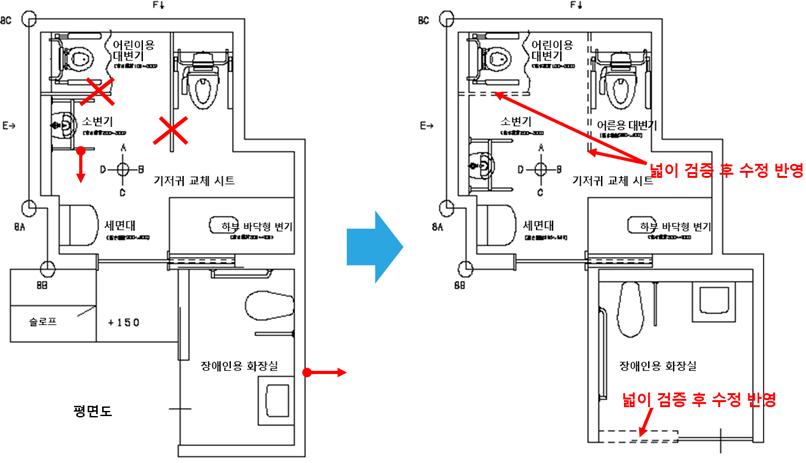 사진 아래에 있는 도면은 목업 검증을 통하여 도면 단계에서 공사 단계로 진행되면서 변경된 화장실입니다.