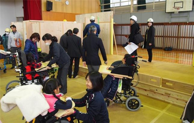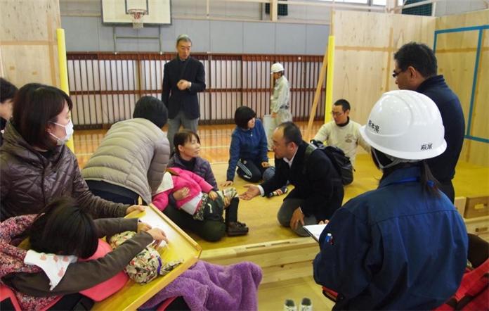 이것은 중도중복 장애를 가진 초중고교생들을 위한 학교인 “구마모토 현립 구마모토 카가야키노모리 지원학교” 설립 프로젝트의 공사 단계에서 사용된 방법입니다. 목수에게 주문하여 실제 치수의 베니어판으로 제작한 목업을 기존 학교의 체육관 내부에 설치하고, 각 공간의 넓이와 높이 등을 확인하는데 이용되었습니다. 이 목업은 베니어판으로 만들어짐에도 불구하고 상당한 비용이 들기 때문에, 미리 건물 공사비에 이 목업의 제작비를 추가할 필요가 있습니다.