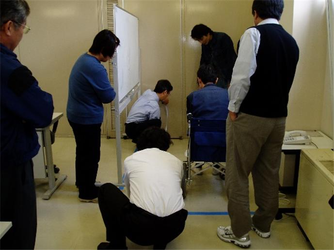 이는 화이트 보드나 기존 건물의 회의실 벽을 이용하여 휠체어용 화장실의 크기를 검증하는 모습입니다. 화이트 보드를 벽으로 간주하는 것인데 가벼워서 이동과 조절이 용이하다는 점이 장점입니다. 도면상의 화장실 크기에서 휠체어를 회전시킬 수 있는지, 휠체어와 보호자가 화장실에 들어가거나 변기에 옮겨 앉기에 충분한 공간이 확보되었는지 등을 검증할 수 있습니다. 간혹 바닥에 박스 테이프를 길게 붙여 벽 라인을 표시하기도 합니다. 이러한 방법은 큰 비용을 들이지 않고도 간편하게 실제 치수를 체험 가능하며, 센티미터 단위의 공간과 형상의 확인 및 조절이 가능합니다.