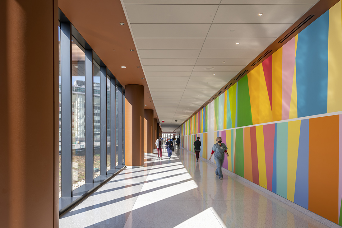 © Nigel Young / Foster + Partners © Penn Medicine © Nigel Young / Foster + Partners 또한 오디리 도날드 오디타(Odili Donald Odita)의 대형 벽화는 에스컬레이터 벽면을 화려하게 장식하고 있다. 선명한 색채와 추상적인 패턴의 작품은 삭막한 병원 공간에 활기를 띠게 하며 보는 이들의 시각을 일깨웠다. 이러한 색채디자인은 병원의 치유 환경에 중요한 역할을 하며 치료에 큰 효과를 가져다줄 것이라고 기대된다.