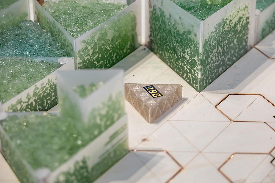 ‘CryoflorE’ 모델은 실제 작동하는 1:1 프로토타입으로, 바이오-태양광 에너지 인프라와 생촉매 세포 네트워크의 작동 원리를 보여준다. 이 시스템은 생분해성 유닛으로 제작되었으며, 완전히 되돌릴 수 있는 가역적 구조를 가지고 있다. 건축 블록은 3D 프린터로 제작된 바이오 폴리머 재질의 부품으로, 알루미늄과 구리로 만든 전도성 양극과 음극이 장착되어 있어 전기 흐름을 생성한다.