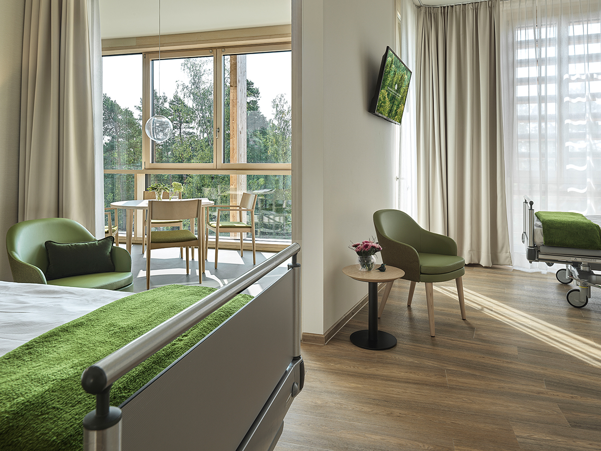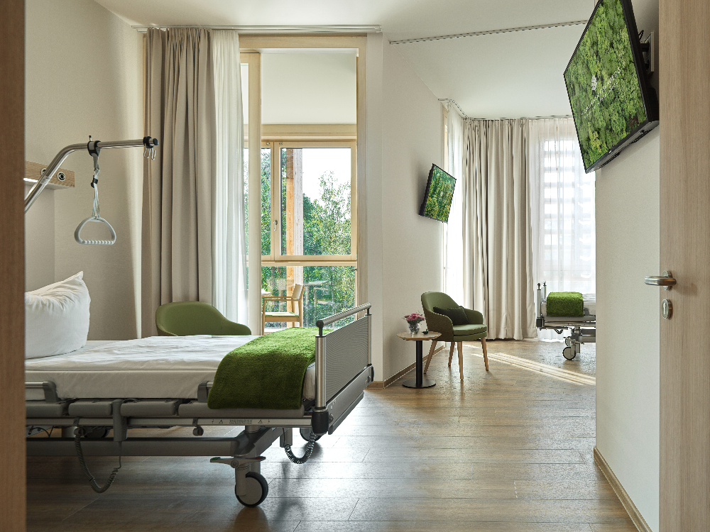 건물의 원형 목재 구조는, 야외 공간에 새로 심은 55그루의 나무와 함께, 숲으로 둘러싸여 있으며, 목재라는 소재 자체를 중심에 두고 있다. 특징은 건물 전체를 아우르는 풍부한 녹지, 자연 소재, 실내와 실외의 조화, 인공조명과 자연광의 세심한 활용, 그리고 동식물에서 영감 받은 색채 구성이라 할 수 있다. 인테리어 콘셉트는 환자들에게 Z자형 2인실에서 사적인 공간을 누리고 휴식할 기회를 제공한다. 모든 병실은 주변 자연을 향하고 있으며, 넓은 베란다가 병실과 서로 연결되어 있다. 병실, 생활 공간, 통합 간호 개념 등 내부 디자인은 외부 자연과의 연결뿐만 아니라 내부 직원과의 투명성까지 보장한다.