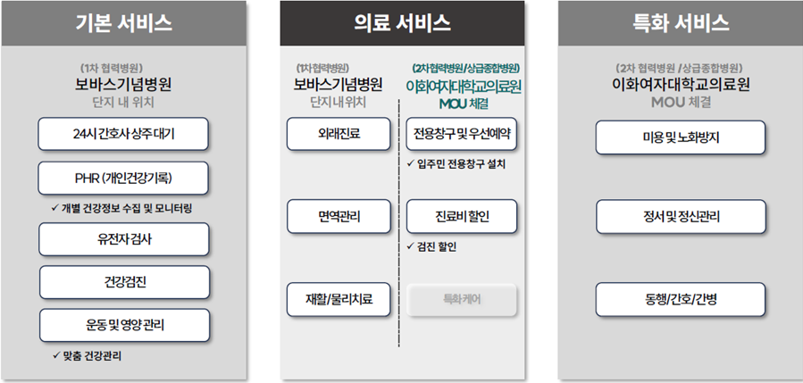 또한 주거단지에서 제공하는 의료 케어 서비스의 주요 방식은 IOT를 활용한 원격 진료 및 건강 데이터 기반 솔루션이 대부분이다. 하지만 노령자 연령이 대부분 75세 전후임을 고려할 때, 주거단지 내 의료 케어 서비스 정착을 위해서는 의료 인력, 서비스 지원 인력 등의 확충이 반드시 필요하고, 이는 관리비 상승 요인으로 작용함으로써, 앞서 언급한 조식 서비스 제공 이상의 주민 반발에 부딪힐 가능성이 높을 것이다. 또한, 아래 실제 실버타운의 의료 서비스는 요양보호사, 간호사 등을 통한 대면 케어 서비스와, 응급 상황에 대처하는 서비스로 75세 전후의 후기 고령자들의 삶의 질, 생명 연장을 고려할 때, 주거단지에서 제공하는 케어 서비스와는 분명한 차이를 가지고 있다.[ VL르웨스트 의료서비스 분석 ]