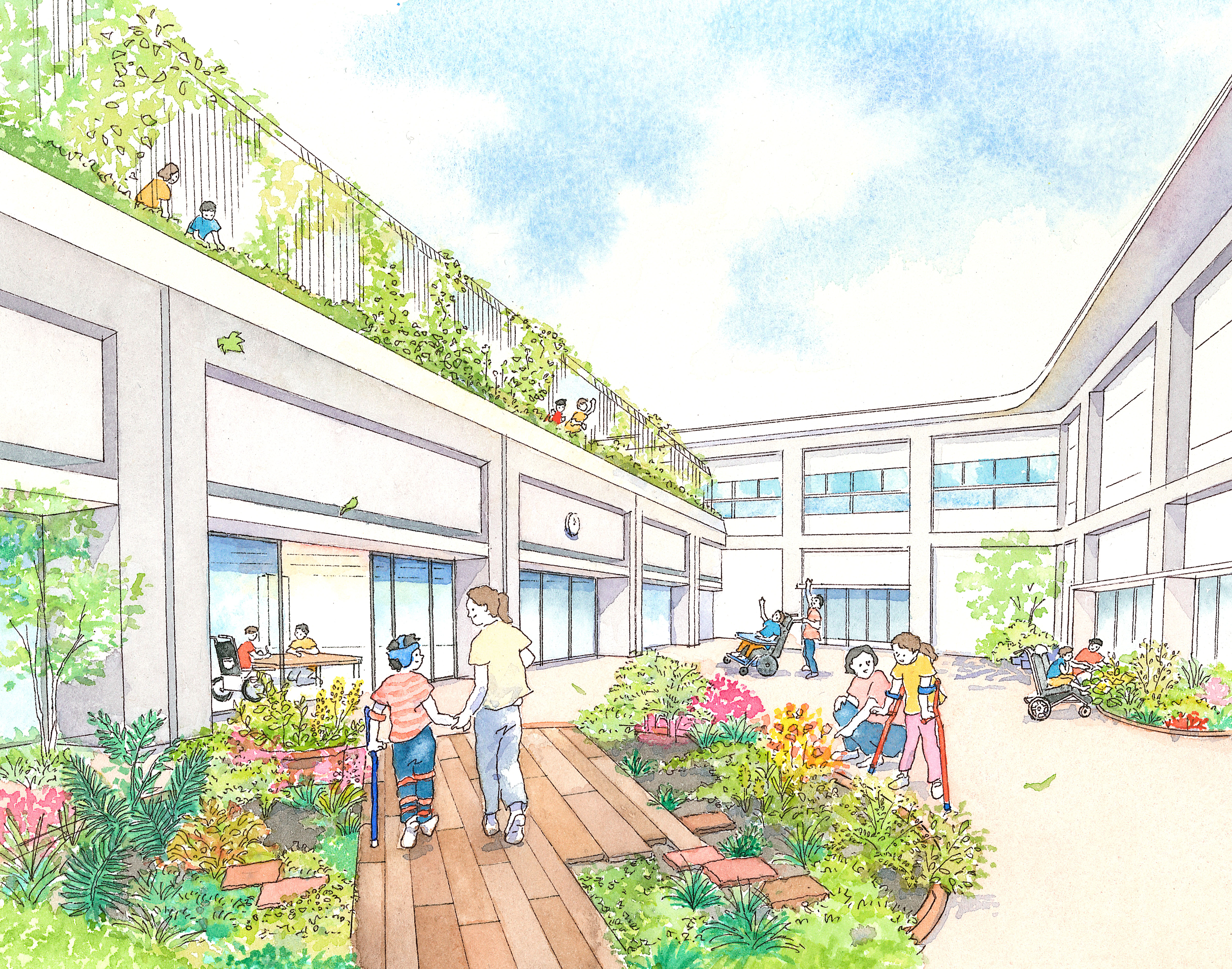 크고 작은 7개의 중정을 배치한 의료, 복지, 교육 통합 시설의 외관 ① 발달장애 아동의 배움과 놀이를 연결하는 통학로