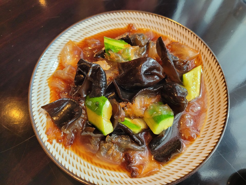 먼저 전채로 나온 ‘생목이 버섯 해파리냉채’는 차지고 쫀득한 목이버섯과 꼬들꼬들하고 쫄깃한 해파리, 아삭한 맛의 오이, 그리고 새콤한 소스의 균형으로 입안에서 감칠맛과 다양한 식감(食感)이 느껴지며 입맛을 돋우는 전채(appetizer)의 역할을 훌륭하게 수행한다. 아…’씹는 맛’도 단맛, 쓴맛 같은 ‘맛’의 일종인가……?