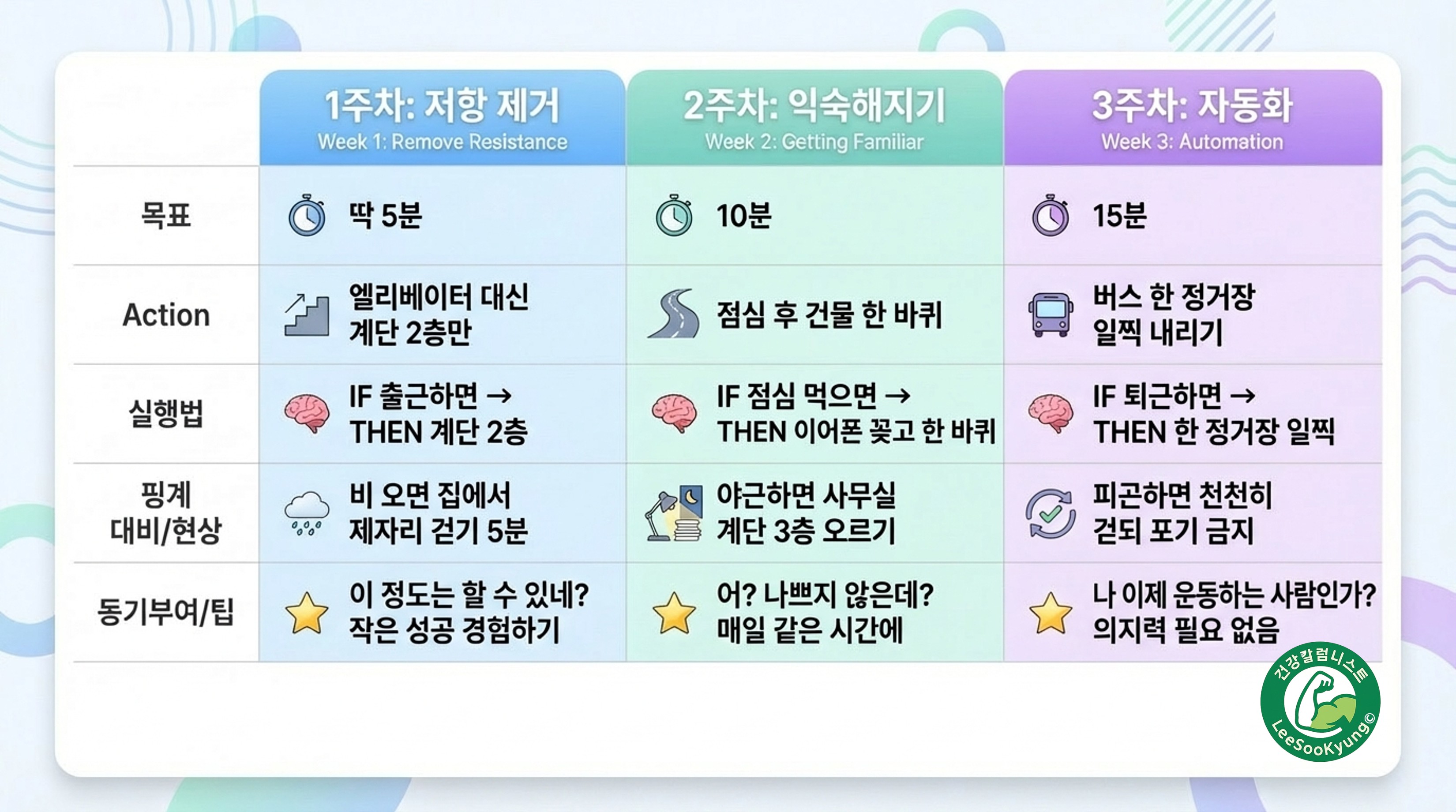 오늘부터 딱 하나만 해봐요. 엘리베이터 버튼 앞에 섰을 때, 손가락을 누르지 말고 계단으로 방향을 틀어보는 거예요. 단 2층만. 그게 끝입니다. 내일도 2층. 모레도 2층. 21일만 버텨 봐요. 21일 후, 당신은 '진짜 당신'이 되어 있을 거예요. 건강해지고 싶었지만 방법을 몰랐던 그 사람.