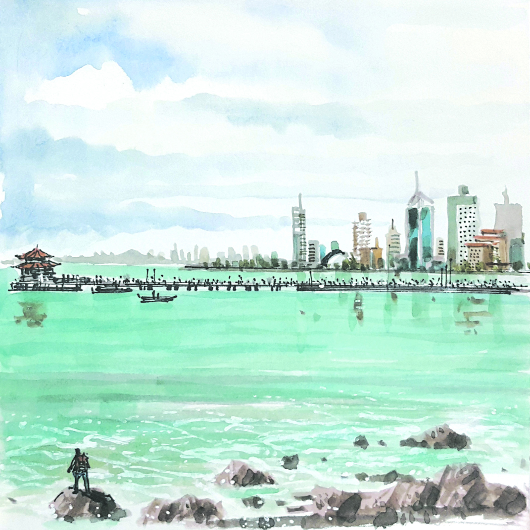 추상 01 칭다오는 맥주 이름으로도 유명하다. 코미디 방송에서 한 개그맨의 '양꼬치 앤 칭따오'라는 애드리브에도 자주 등장해서 친근하다. 칭다오 맥주병의 상표를 잘 살펴보면 작은 누각이 그려져 있다. '후이란거, 回瀾閣(회란각)'라는 이름의 이 누각은 팔각형의 2층 건물로 잔교(棧橋)의 끄트머리에 위치하며 청도 10경 중 으뜸으로 꼽힌다. 기다란 잔교와 후이란거, 그리고 그 배경에 초고층 빌딩의 도시가 오버랩되는 다소 묘한 풍경은 칭다오의 대표적 상징이다. 과거와 현재가 잔교로 이어져있다. 높은 곳에 위치한 소어산 공원의 전망대에 올라 바라보아도 매력적인 경관임에 틀림없다. 하지만 잔교가 칭다오 여행 추천 하이라이트 중 하나 임에 확실한 이유는 그 위를 가득 메운 사람들도 한 몫 한다는 생각이 들었다. 접근이 어려울 정도로 다리 위에 많은 방문객들이 인산인해를 이루며 진풍경을 연출하고 있다.