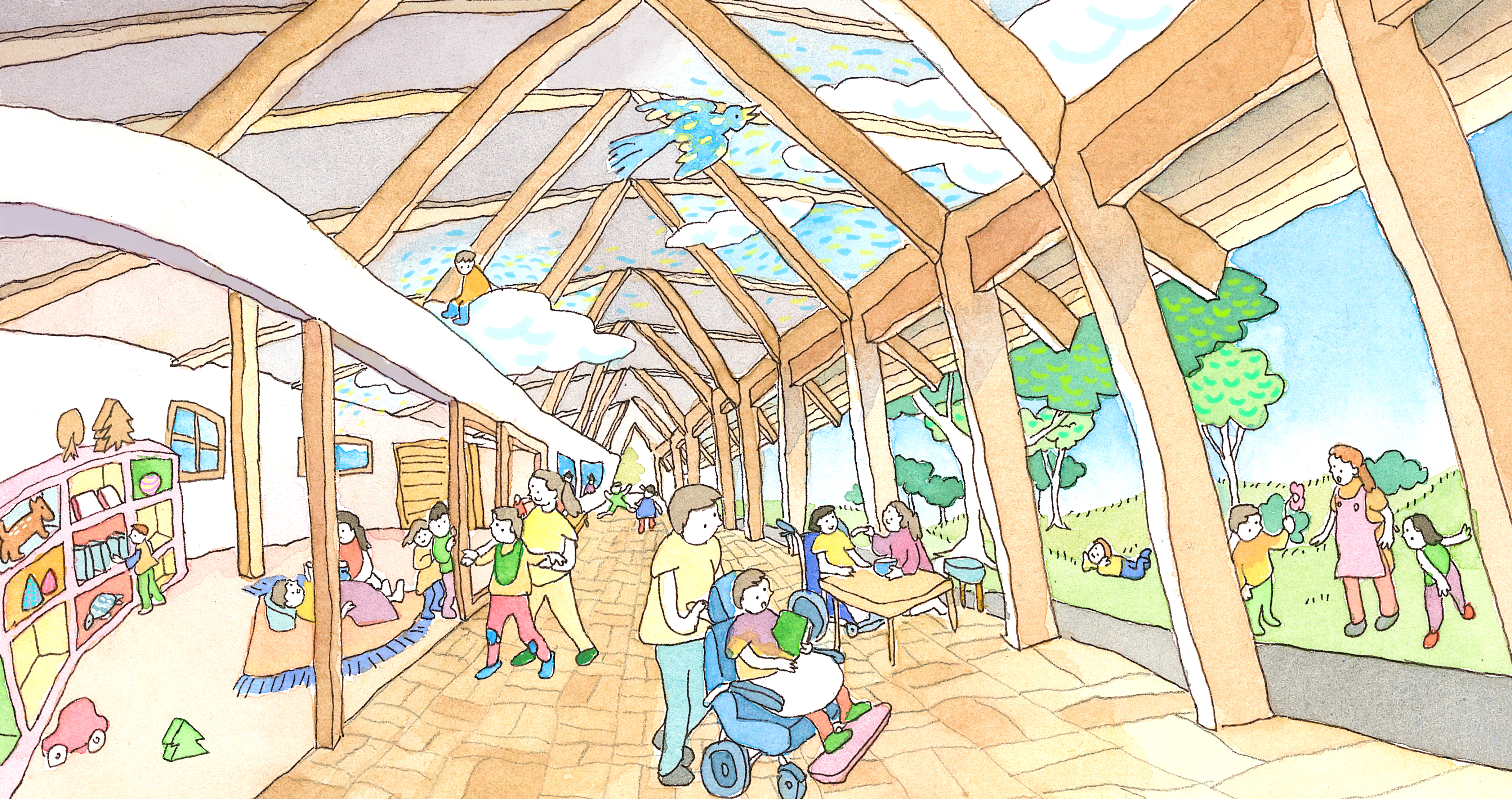 위와 같이 미래를 위한 여백을 설정하거나, 리모델링의 용이성을 위하여 철골조를 택하는 등 향후의 변동을 처음부터 고려하여 설계를 진행했던 것이 ‘콘고복지센터 카츠라기·니죠’입니다. 건물의 이곳저곳에 중정 즉 여백을 배치하고, 가느다란 철골기중을 활용한 철골조를 채택하여 일상 생활에 지장을 주지 않도록 함으로써 미래의 변화에 유연하게 대응할 수 있도록 계획했습니다.