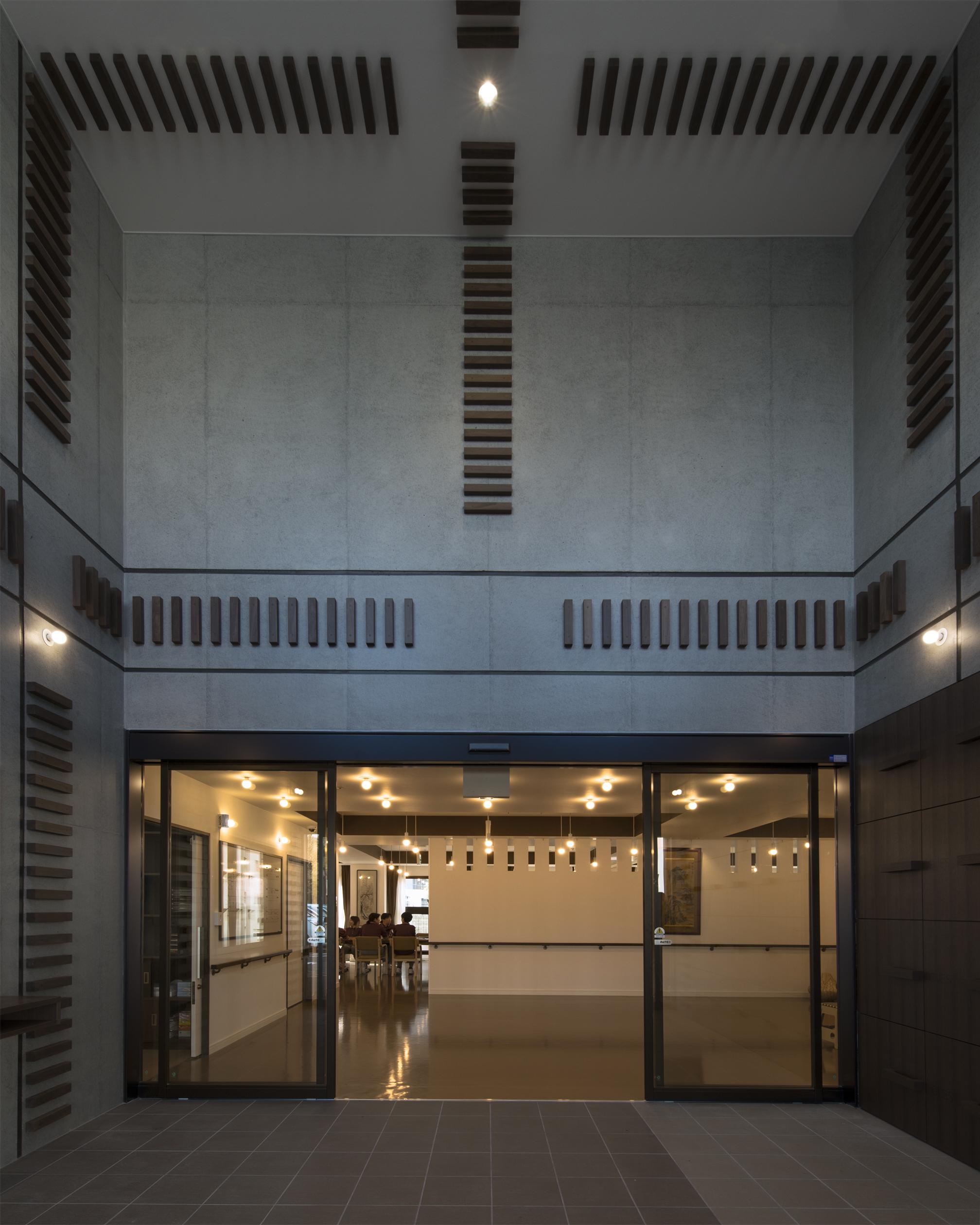 (c) Tetsuya Yashiro 내부 디자인은 차분하면서도 따뜻한 분위기를 조성하기 위해 흰색과 갈색 톤을 중심으로 구성되었다. 입구 홀에는 외관 파사드에 적용된 줄무늬 패턴을 목재 소재로 재해석해 적용함으로써, 실내외 디자인의 연속성과 완성도를 높였다. 일반적으로 요양시설에서는 관리 효율을 고려해 비닐 소재가 주로 사용되지만, 이 시설은 난간과 손잡이에 목재를 적용해 입주자들이 자연 소재가 주는 온기와 안정감을 일상적으로 느낄 수 있도록 배려했다.