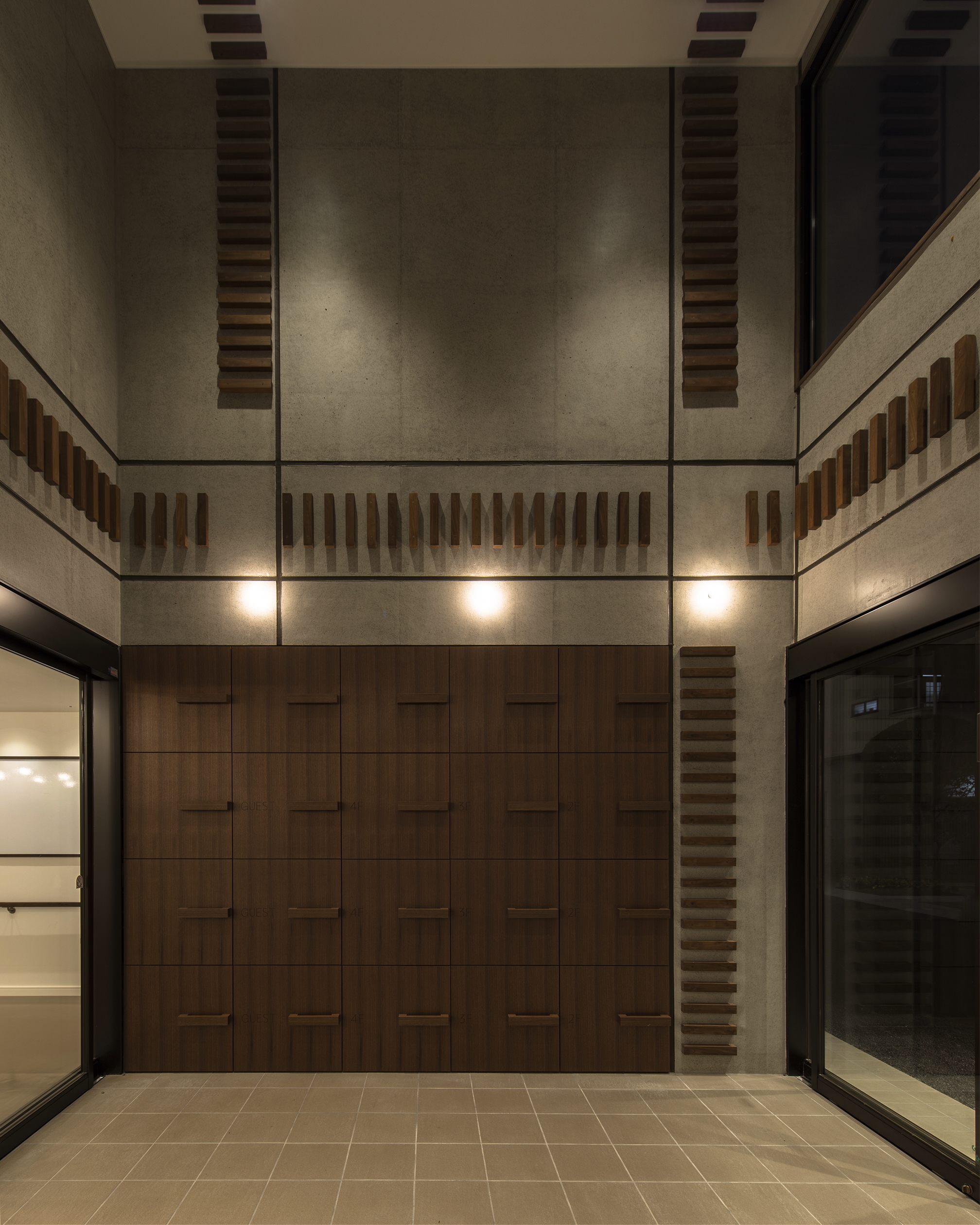건물의 외관은 노출 콘크리트 마감으로 견고하고 안정적인 인상을 주며, 지진을 비롯한 각종 재해에 대비한 안전 중심의 설계가 적용되었다. 특히 콘크리트 특유의 차가운 이미지를 완화하기 위해 맞춤형 거푸집을 사용해 질감이 살아 있는 표면을 구현한 점이 인상적이다. 파사드에 적용된 미세한 줄무늬 형태의 돌기는 일정한 음영을 형성해 표면의 단조로움을 줄이는 동시에, 오염이 상대적으로 덜 드러나 유지 관리 비용 절감에도 기여한다. 여기에 균열 발생을 최소화하기 위해 플라이애쉬 콘크리트를 사용함으로써 구조적 안정성과 내구성을 한층 강화했다.