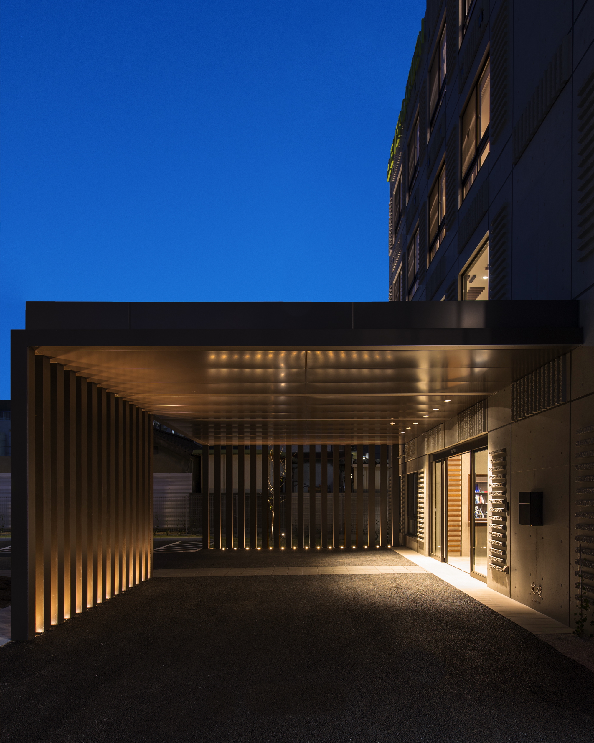 (c) Tetsuya Yashiro 건물은 부지 남측에 밀집 배치되어 있으며, 원활한 차량 동선을 고려해 일방통행 체계로 계획되었다. 특히 거주자와 방문객의 승·하차가 원활하도록 가로 11m, 세로 6m 규모의 대형 캐노피를 설치해, 우천 시에도 불편함 없이 이동할 수 있도록 했다. 또한 부지 일부를 개방해 충분한 주차 공간을 확보하는 한편, 지역 주민들도 이용할 수 있는 정원 공간을 조성해 개방성을 더했다. L자형 부지의 형태는 주변 환경과 자연스럽게 어우러지며, 보행과 차량의 자유로운 통행을 가능하게 한다.