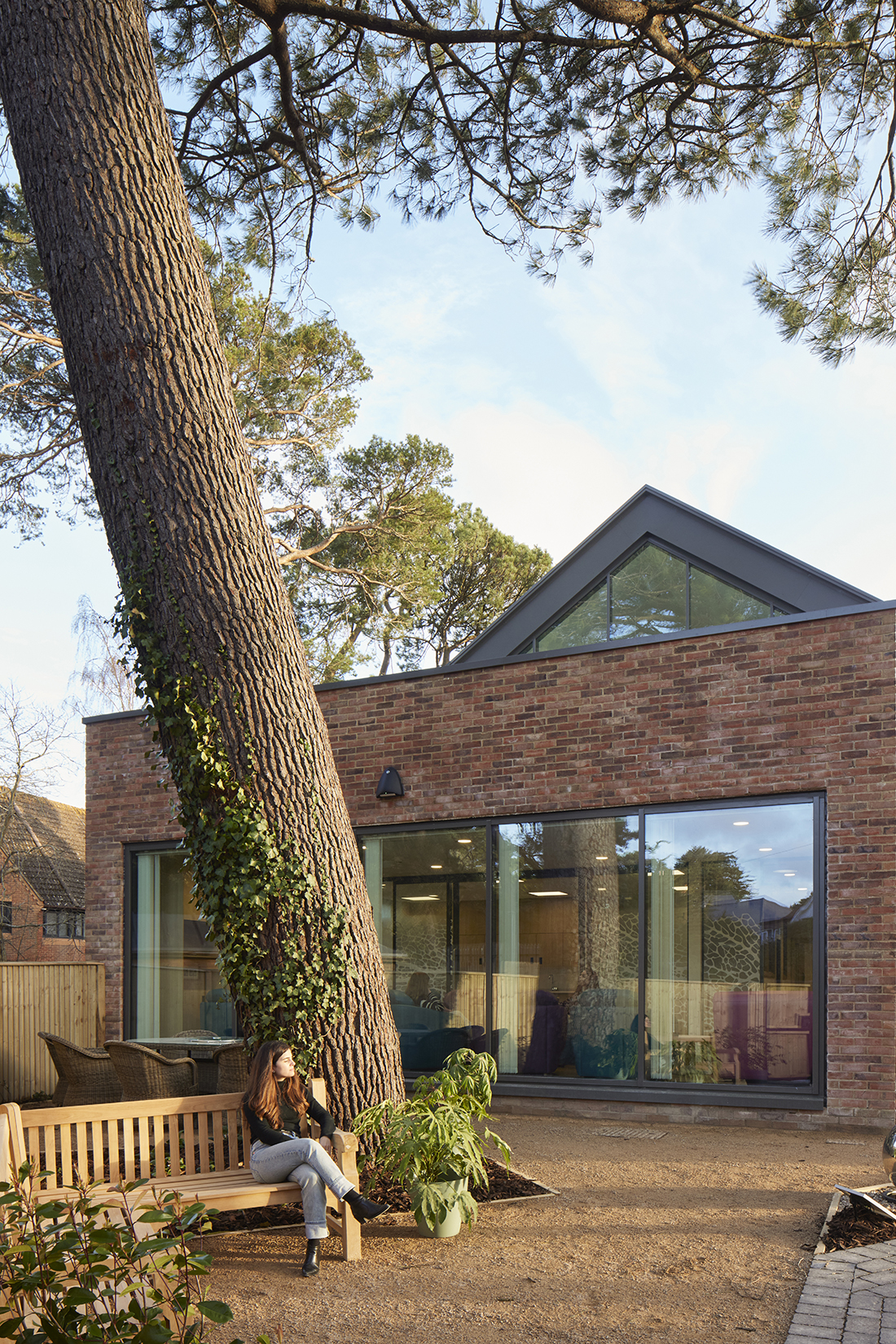 이 건물은 도싯 세인트 앤스 병원(St Ann’s Hospital) 부지 내 해안가 모래언덕에 자리하며, 부지를 채우고 있는 오래된 해안 수목 보존과 주변 지역 맥락 존중을 핵심 원칙으로 삼아 계획됐다. 건물의 규모와 배치는 기존 자연환경에 대한 개입을 최소화하는 방향으로 설정됐고, 이에 따라 2층 규모의 매스는 도로 방향으로 갈수록 1층으로 낮아지는 단계적 구성을 통해 주변 경관과 자연스럽게 어우러진다.