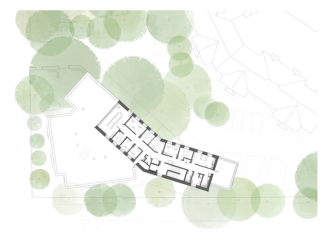 치료 특성을 고려해 침실은 환자가 편안한 시간을 보낼 수 있도록 계획됐으며, 휴식과 사색 중심 공간으로 디자인됐다. 돌출형 창은 앉은 자세에서도 우거진 숲속 공터의 나무를 바라볼 수 있도록 하며, 동시에 실내 깊숙이 자연광이 스며들도록 했다.