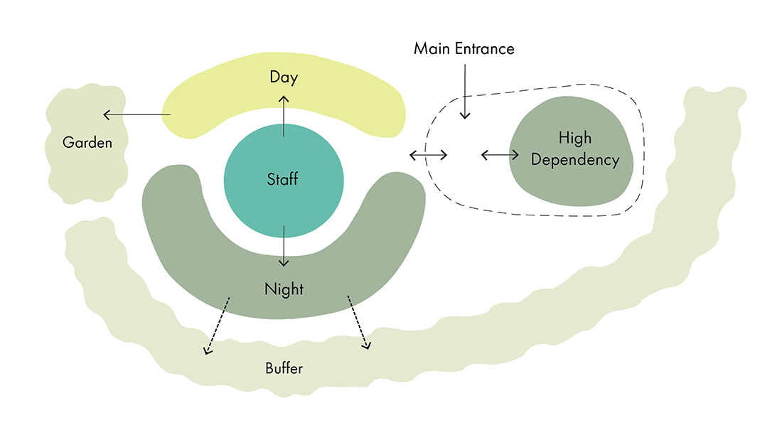 또한 치료 목적으로 활용 가능한 개인 야외 정원이 마련돼 있으나, 치료를 저해할 수 있는 과도한 운동은 제한하도록 계획됐다. 더욱이 환자 상태에 따라 외부 공간 이용이 제한되는 경우에도 라운지와 활동실에 설치된 넓은 유리창을 통해 정원 조망이 가능하도록 해, 실내에서도 자연과의 연결성이 유지되도록 한 점이 돋보인다.