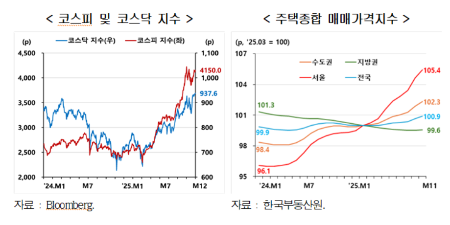 자산 가격 상승에 따른 자산 가치 증가로 인해 민간소비가 확대되는 자산효과(Wealth effect)가 나타날 수 있다. 2025년 들어 주식시장이 상승장에 진입하면서 코스피 지수는 사상 처음으로 4,000p를 돌파했으며, 코스닥 지수도 큰 폭의 상승세를 보이고 있다. 코스피 지수는 2025년 1월 2,400p 대에서 반도체 슈퍼사이클, 코리아 디스카운트 해소 기대, 외국인 매수세 유입 등으로 인해 10월 27일 처음으로 4,000p를 상회했으며, 12월 12일 기준 4,150p를 기록하고 있다. 한편, 서울을 중심으로 수도권 주택매매가격 상승세가 지속되는 가운데 지방권 주택매매가격도 최근 회복 국면에 진입하는 모습이 나타나고 있다.