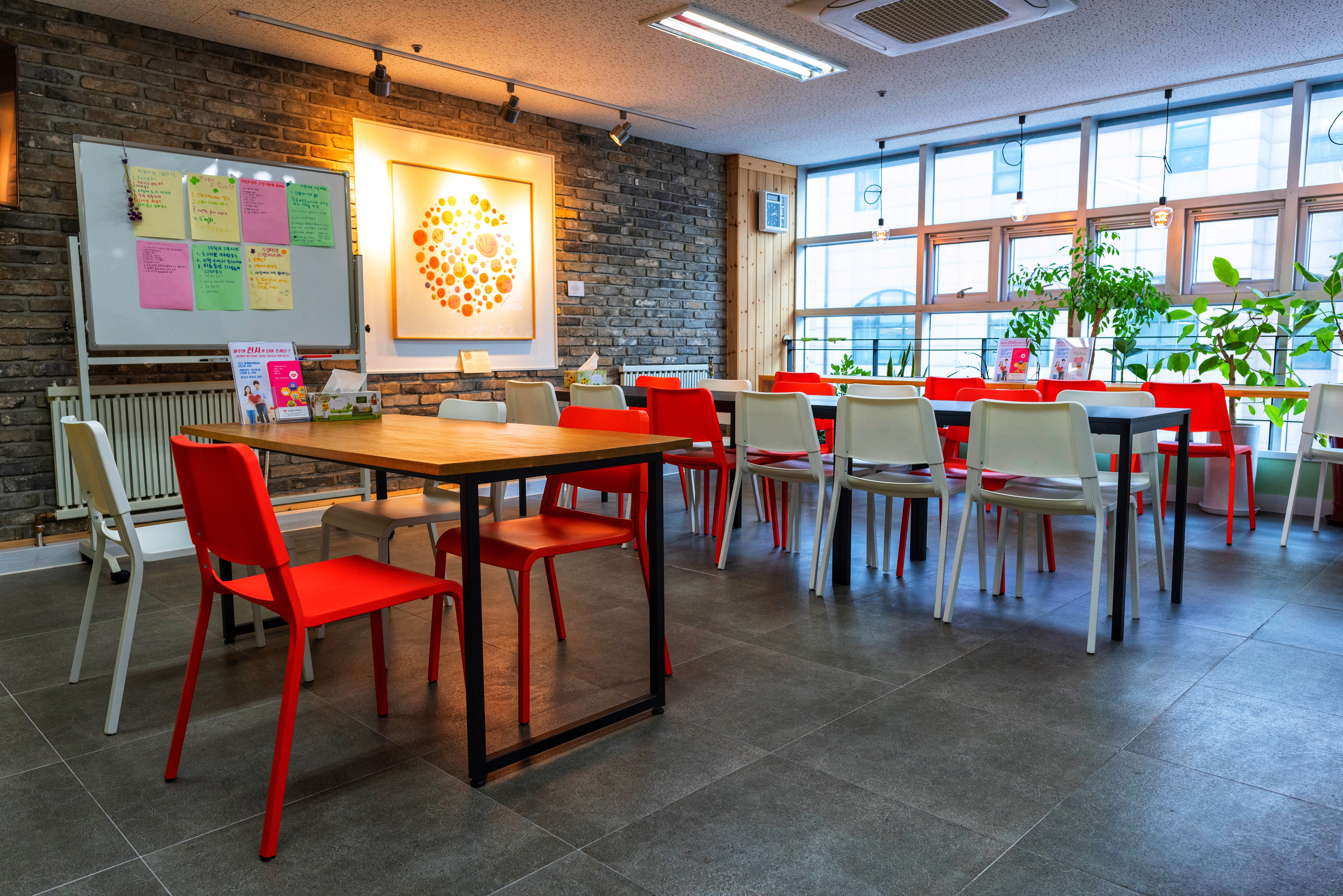 참고로 해당 사무 공간은 원래 다른 용도로 사용되던 장소였습니다. 리모델링 과정에서 공사비를 절감하기 위해 기존의 벽 마감을 그대로 살리고, 필요한 부분에만 가벽을 새로 세우는 방식으로 공간을 구성했습니다. 천장은 별도의 마감 없이 오픈 천장 구조로 설계했으며, 회의실로 활용하기 위한 최소한의 공간 구성만을 적용했습니다. 이러한 구조가 오히려 자유롭고 개방적인 분위기를 형성해, 팀원 간의 소통과 협업에 긍정적인 영향을 주고 있다고 생각합니다.