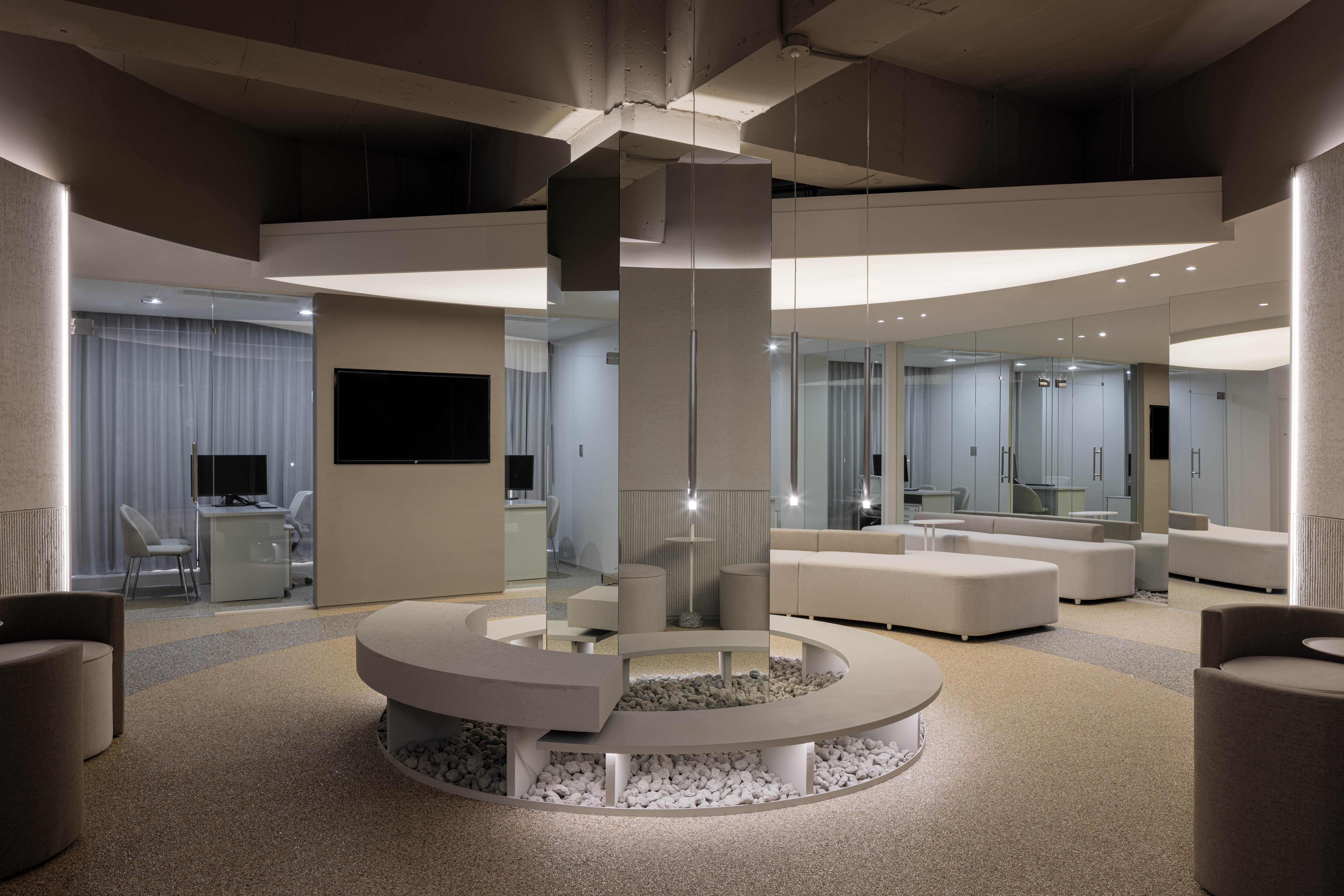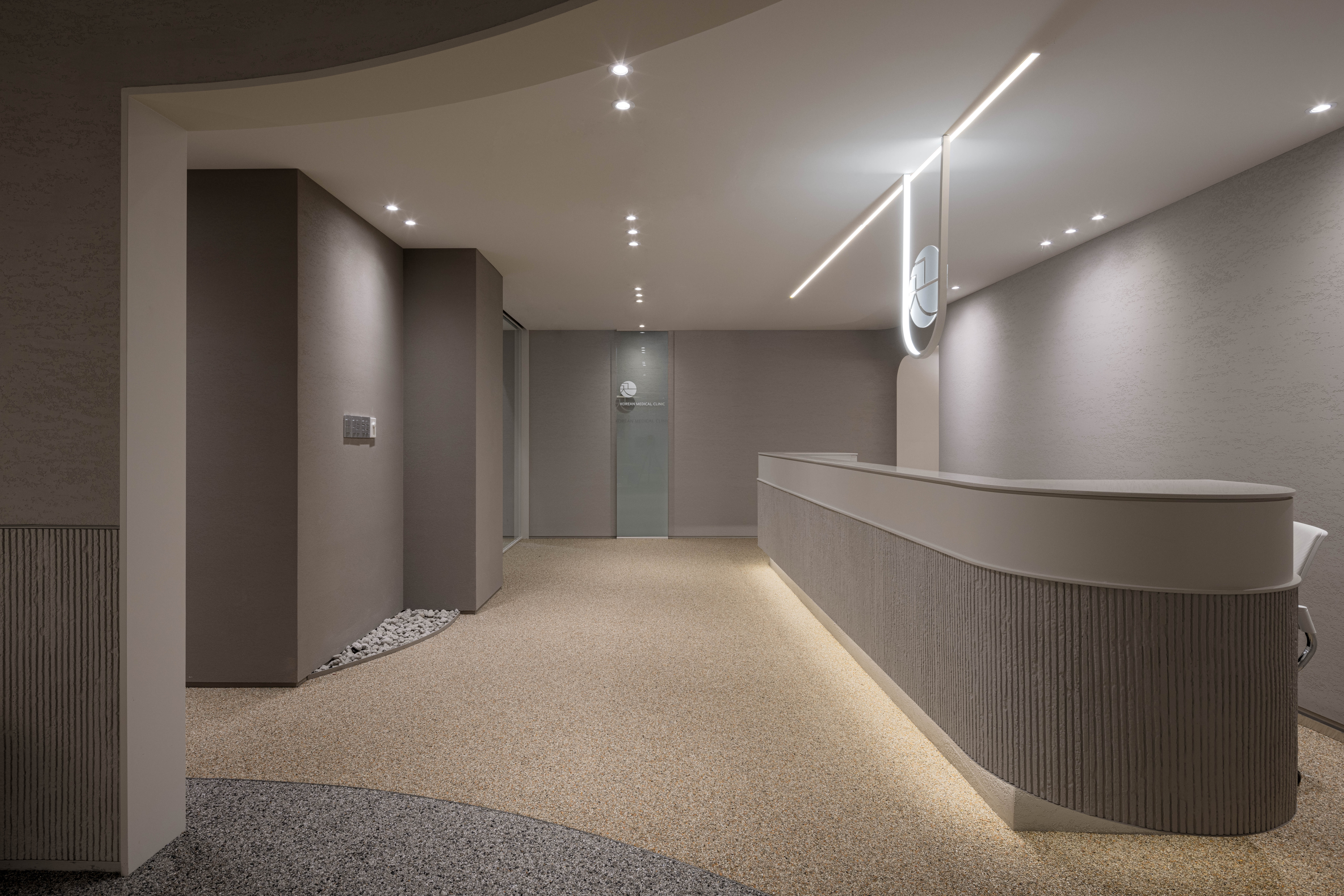 내부 복도는 양방향으로 이동이 가능한 순환적인 구조로 동선의 효율성을 더했다. 복도 한 쪽에 자리한 중간 대기 공간은 시술실로 들어가기 전, 잠시 대기할 수 있는 곳으로 한 톤 더 낮춘 어두운 색감으로 우아하고 깊이있는 분위기를 형성한다. 직접적인 다운라이트를 최소화하고, 벽체 곳곳에 자리잡은 라인 간접 조명을 이용해 더욱 아늑함을 살리고, 치유의 시간으로 몰입을 유도했다.