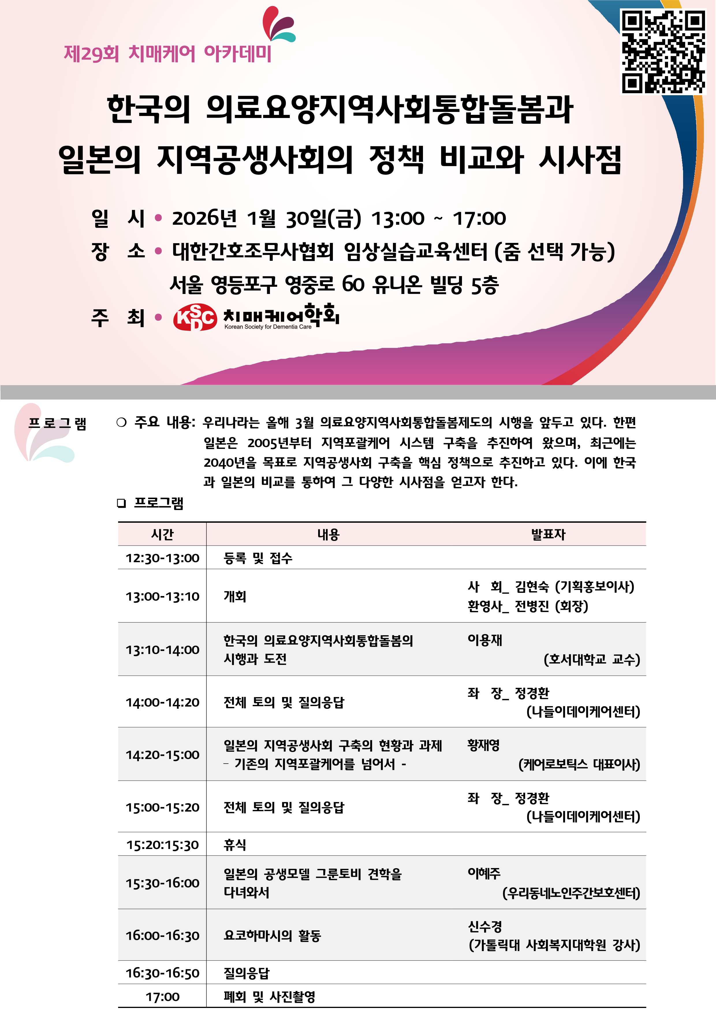 (사)치매케어학회는 지난 1월 30일 대한간호조무사협회 임상실습교육센터에서 ‘한국의 의료요양지역사회통합돌봄과 일본의 지역공생사회의 정책 비교와 시사점’을 주제로, 제29회 치매케어 아카데미를 개최했다. 이번 아카데미는 오는 3월 시행을 앞둔 ‘의료요양지역사회통합돌봄제도’를 계기로, 제도의 방향성과 목표, 그리고 향후 구축 과정에서 고려해야 할 과제들을 심도 있게 논의하기 위해 마련됐다. 특히 일본은 2005년부터 지역포괄케어 시스템을 단계적으로 추진해 왔으며, 최근에는 2040년을 목표로 ‘지역공생사회’ 구축을 핵심 국가 정책으로 제시하고 있어, 한국에 중요한 비교 사례가 되고 있다. (사)치매케어학회는 “이번 세미나는 한·일 양국의 정책 경험을 비교·분석함으로써 한국형 의료요양지역사회통합돌봄 체계의 발전 방향을 모색하고, 실질적인 시사점을 도출하는 데 목적이 있다”고 밝혔다. 이에 매거진HD는 제29회 치매케어 아카데미에서 발표된 몇 가지 주요 내용을 중심으로, 한국과 일본의 정책 흐름과 핵심 쟁점을 정리해 보고자 한다.