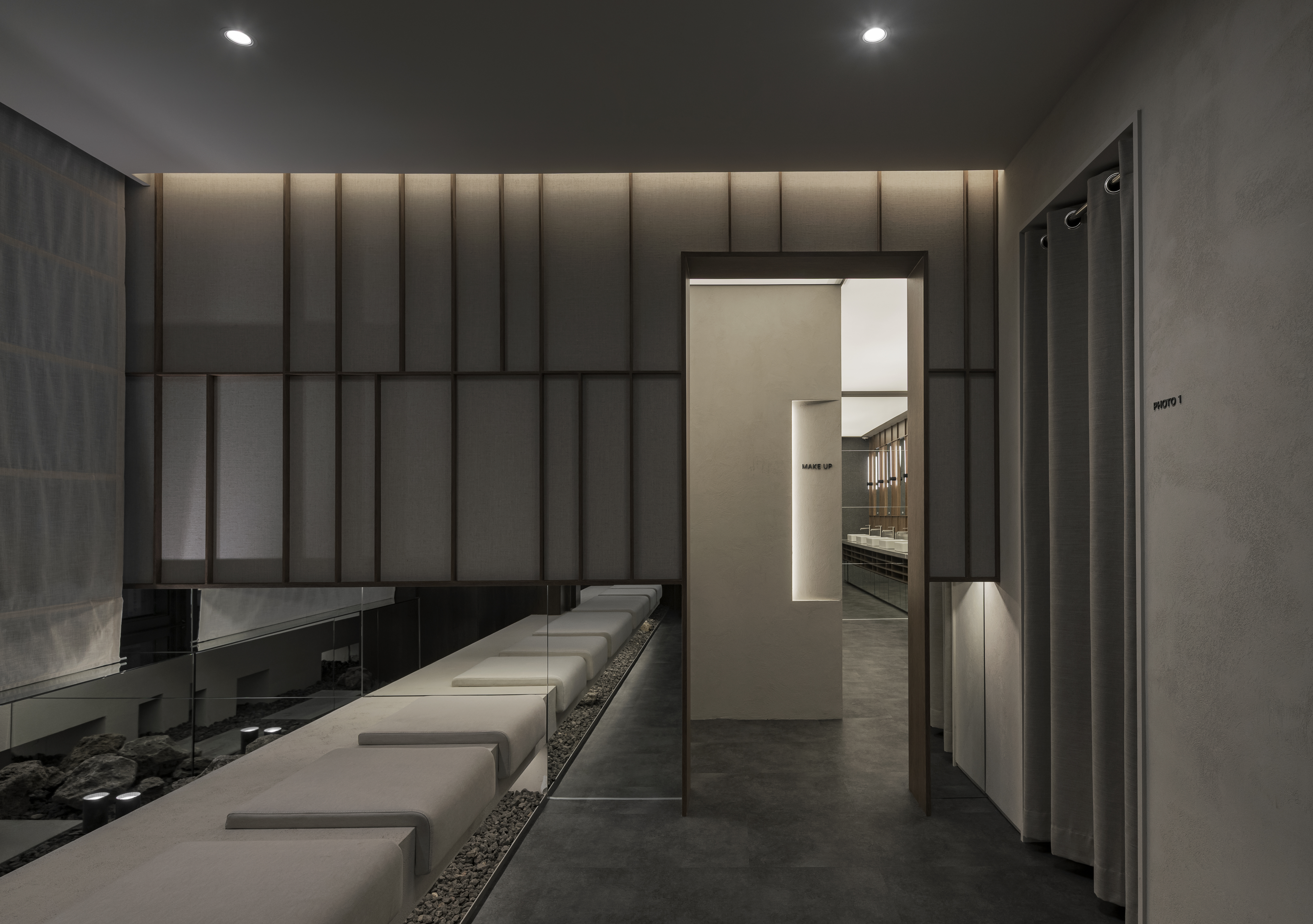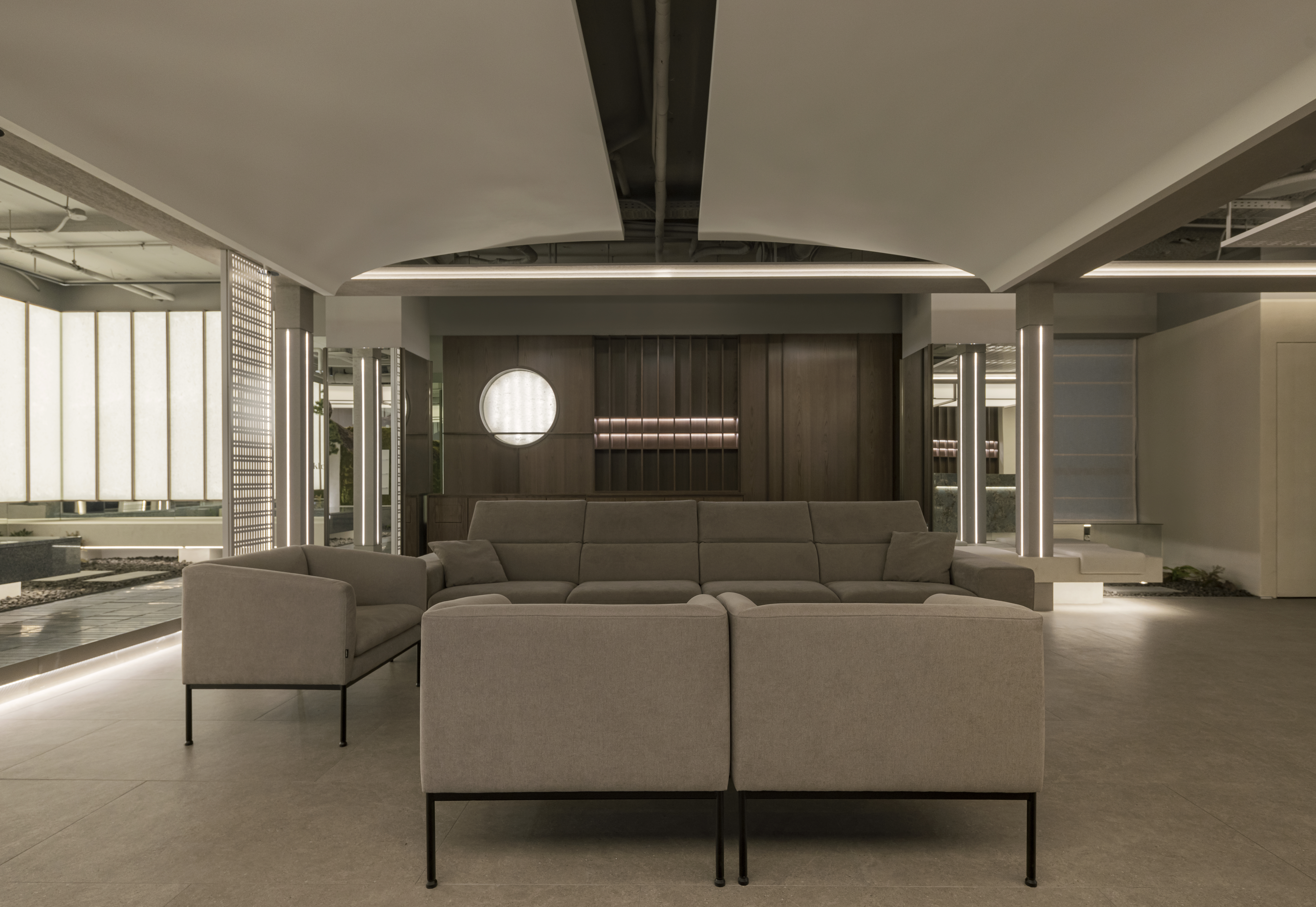 또한 벽체는 한지를 활용한 창호적 구성으로 디자인해 빛이 표면을 스며들 듯 은은하게 퍼지도록 했다.