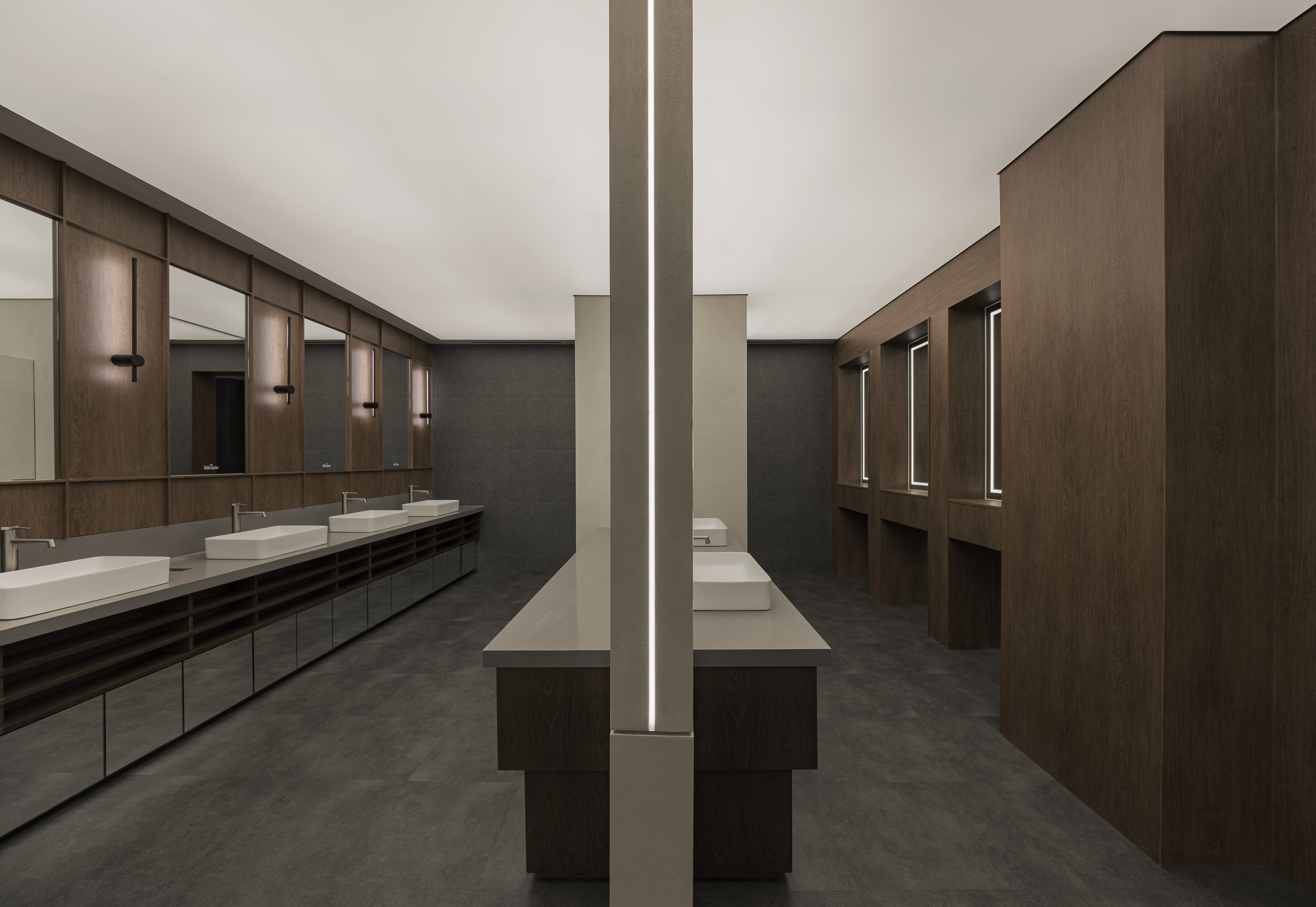 VVIP실 -1 공간의 핵심이 되는 형태는 한옥의 목조 기둥에서 영감을 받은 수직 구조로 공간을 분리하고 리듬감을 형성하였다. 단순한 구조체를 넘어, 시선의 흐름을 조율하고 천정을 무게감 있게 잡아주어 공간의 중심을 형성하여 편안한 대기공간을 만들었다.