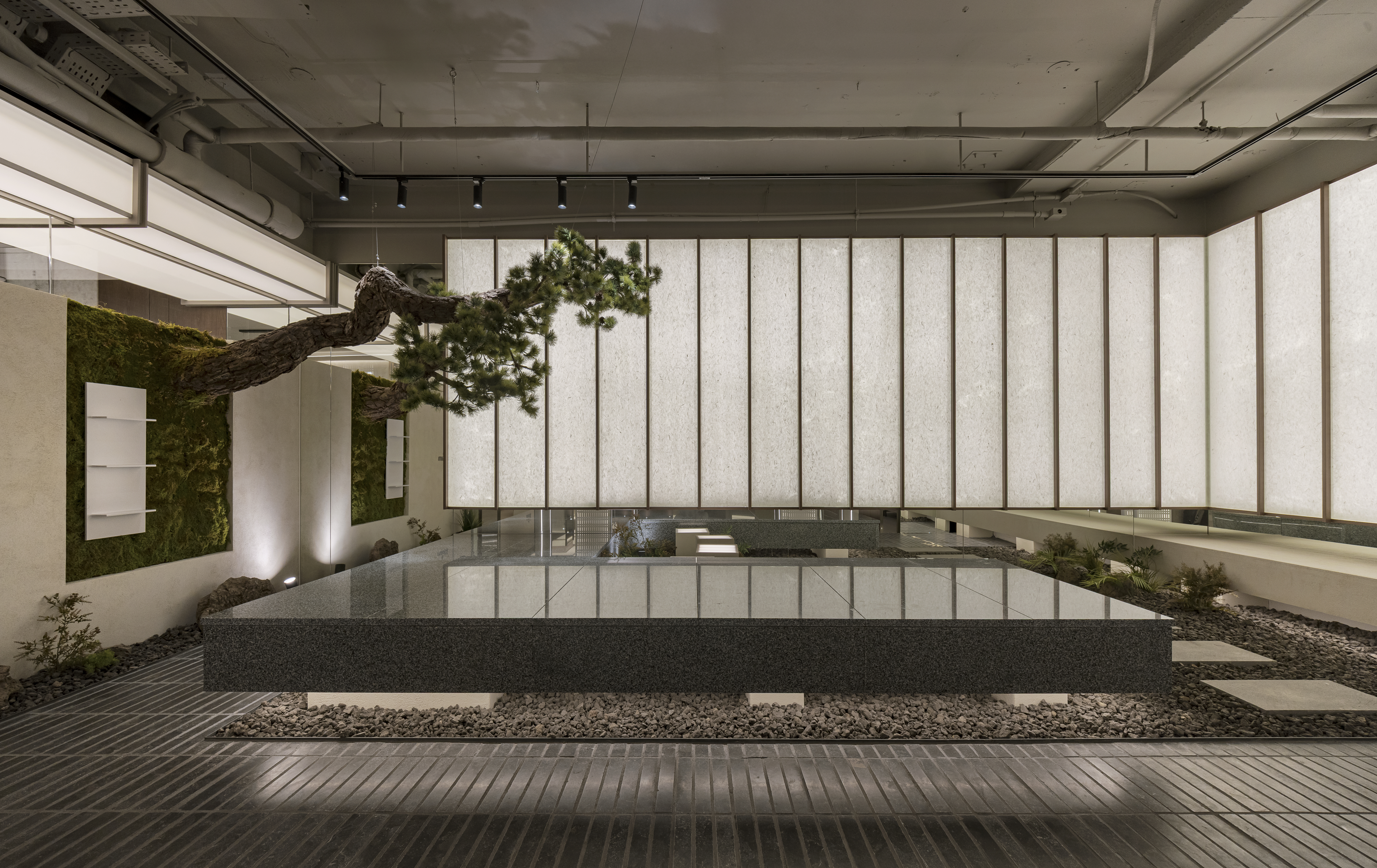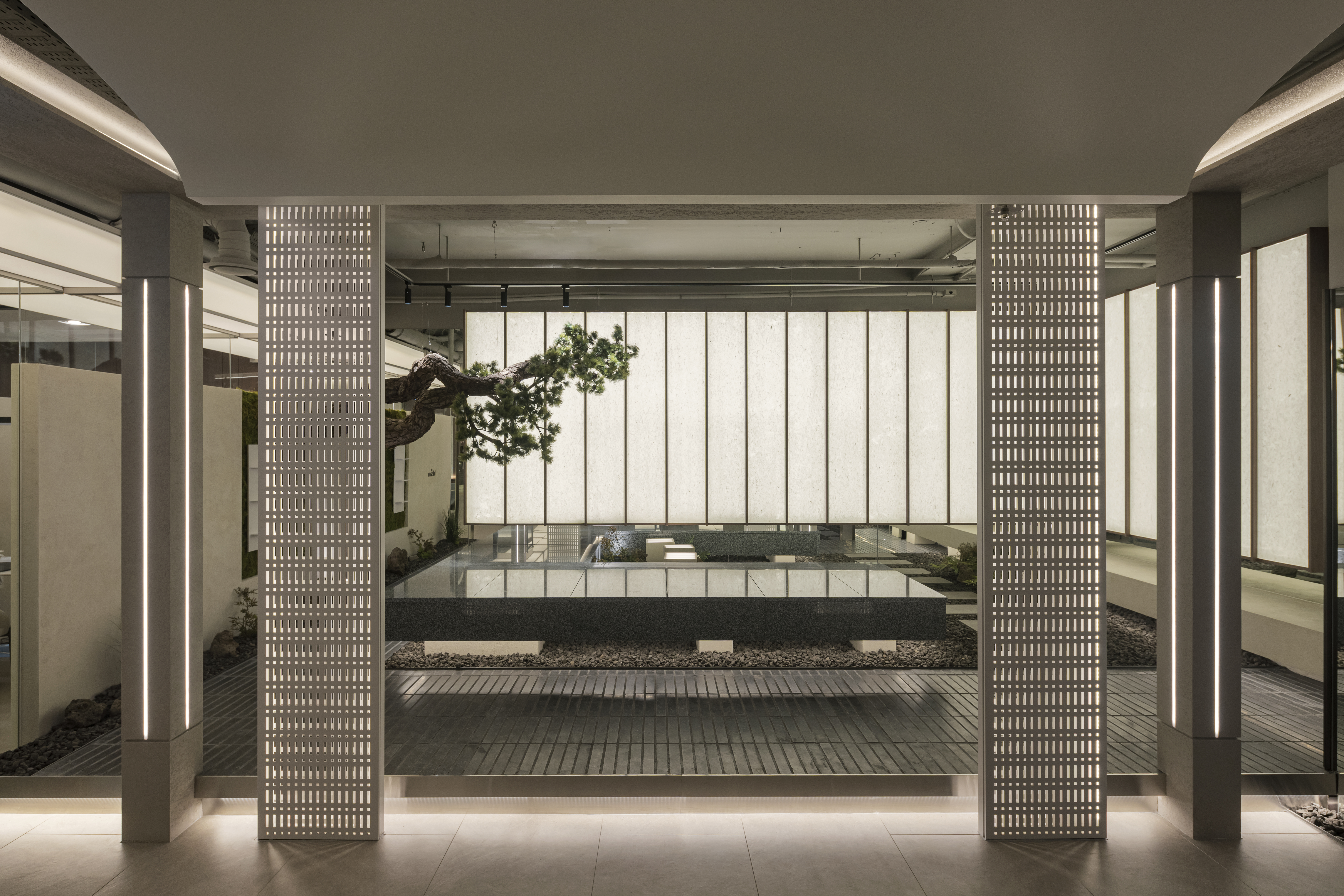 간접적으로 비춰지는 조명은 소나무 오브제에 생명력이 깃든 듯한 인상을 부여하며, 마치 따뜻한 빛 속에서 나무가 천천히 자라나는 순간을 포착한 듯한 정적이면서도 생동감 있는 공간 분위기를 만든다. 수직 구조, 소나무 오브제, 한지의 조명 요소가 하나로 어우러지며 방문객은 마치 중정 한가운데 앉아 있는 듯한 심리적 안정감과 깊은 몰입감을 동시에 느끼게 된다.